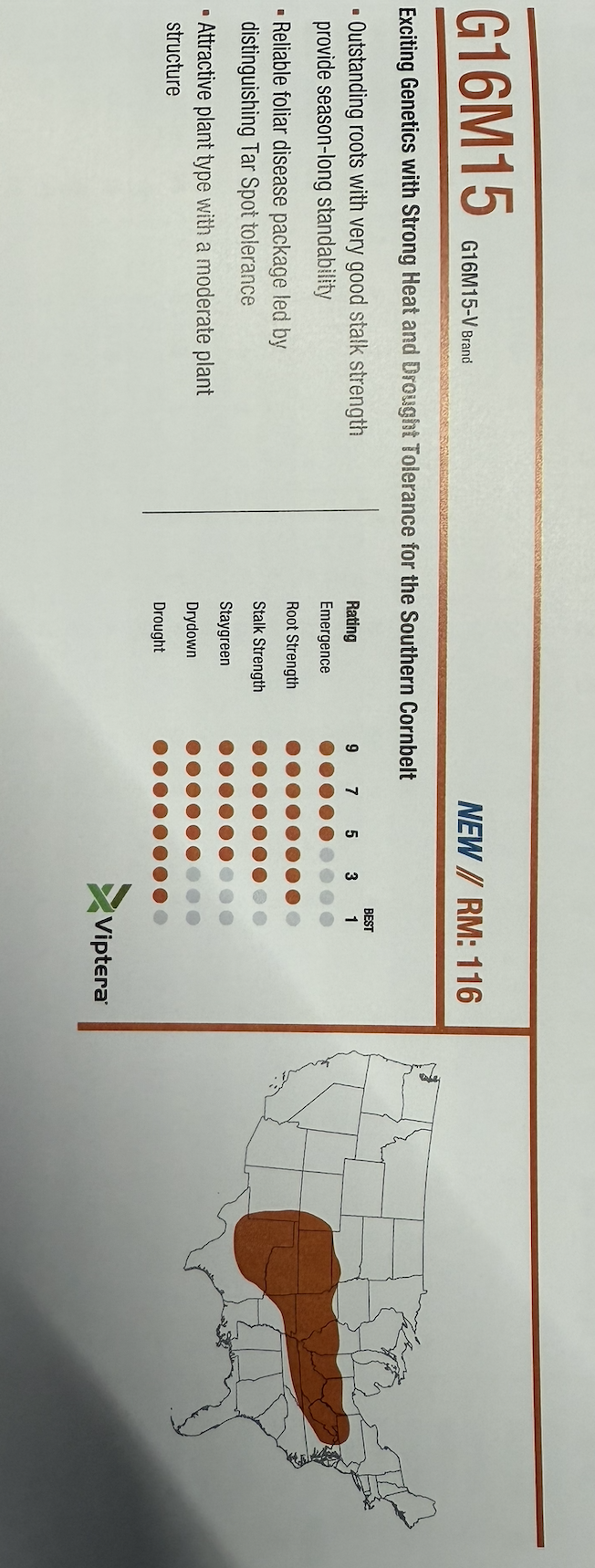 Corn G16M15 Exciting genetics with strong heat and drought tolerance for the southern cornbeltOutstanding roots with very good stalk strength provide season-long standabilityReliable foliar disease package led by distinguishing Tar Spot toleranceAttractive plant type with moderate plant structure Tech Sheet